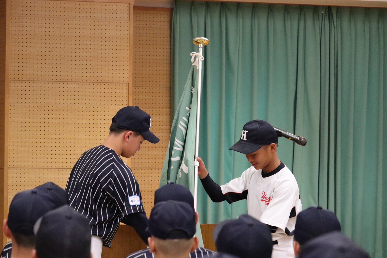 【52期 松尾キャプテンから、53期 大高キャプテンへ団旗の受け渡し】